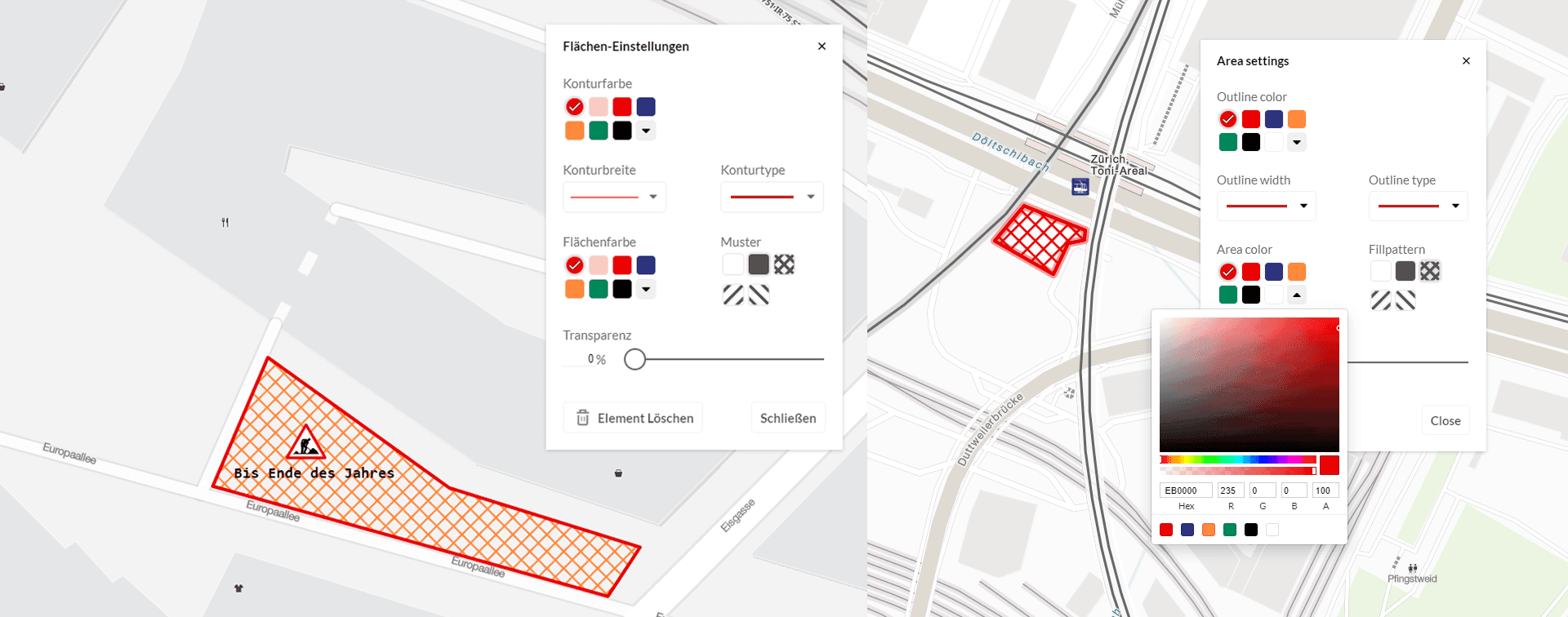 Ab sofort haben Sie die Möglichkeit, Ihre Pläne durch das Einzeichnen von Polygon-Flächen noch informativer zu gestalten. Beispielsweise lassen sich Baustellen oder andere Ereignisse an Haltestellen, Bahnhöfen und im Umfeld grafisch darstellen. Mit Hilfe des überarbeiteten Feature-Styler-Popups können diese Flächen nach Belieben gestaltet werden. Zur Gestaltung der Flächen stehen unterschiedliche Linien und Füllmuster zur Verfügung.